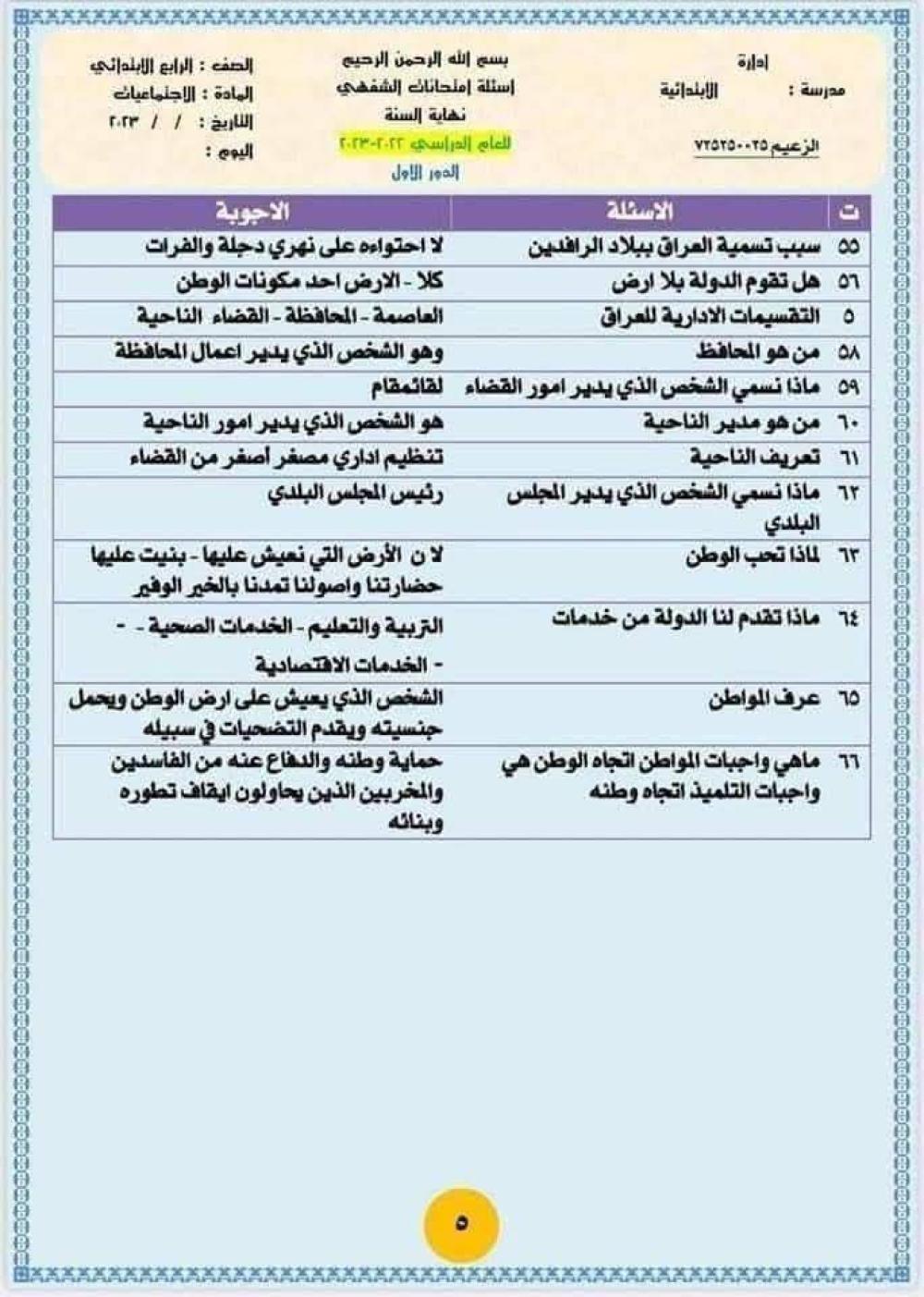 أسئلة الاجتماعيات للصف الرابع الابتدائي