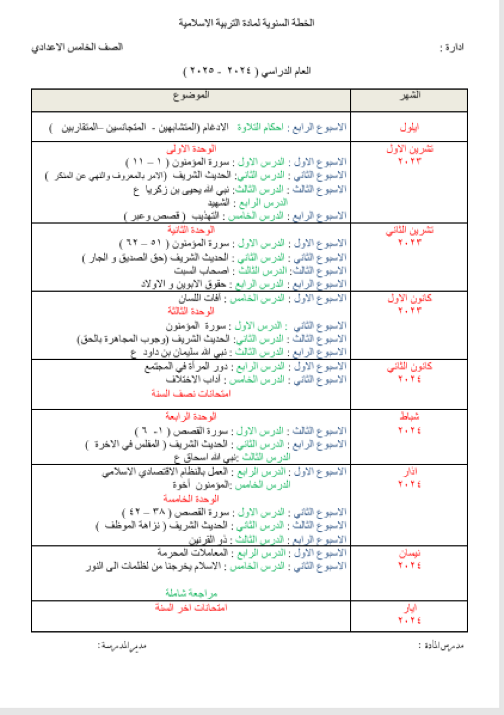 الخطة السنوية لمادة الاسلامية ( 2024 - 2025 ) الصف الخامس الاعدادي