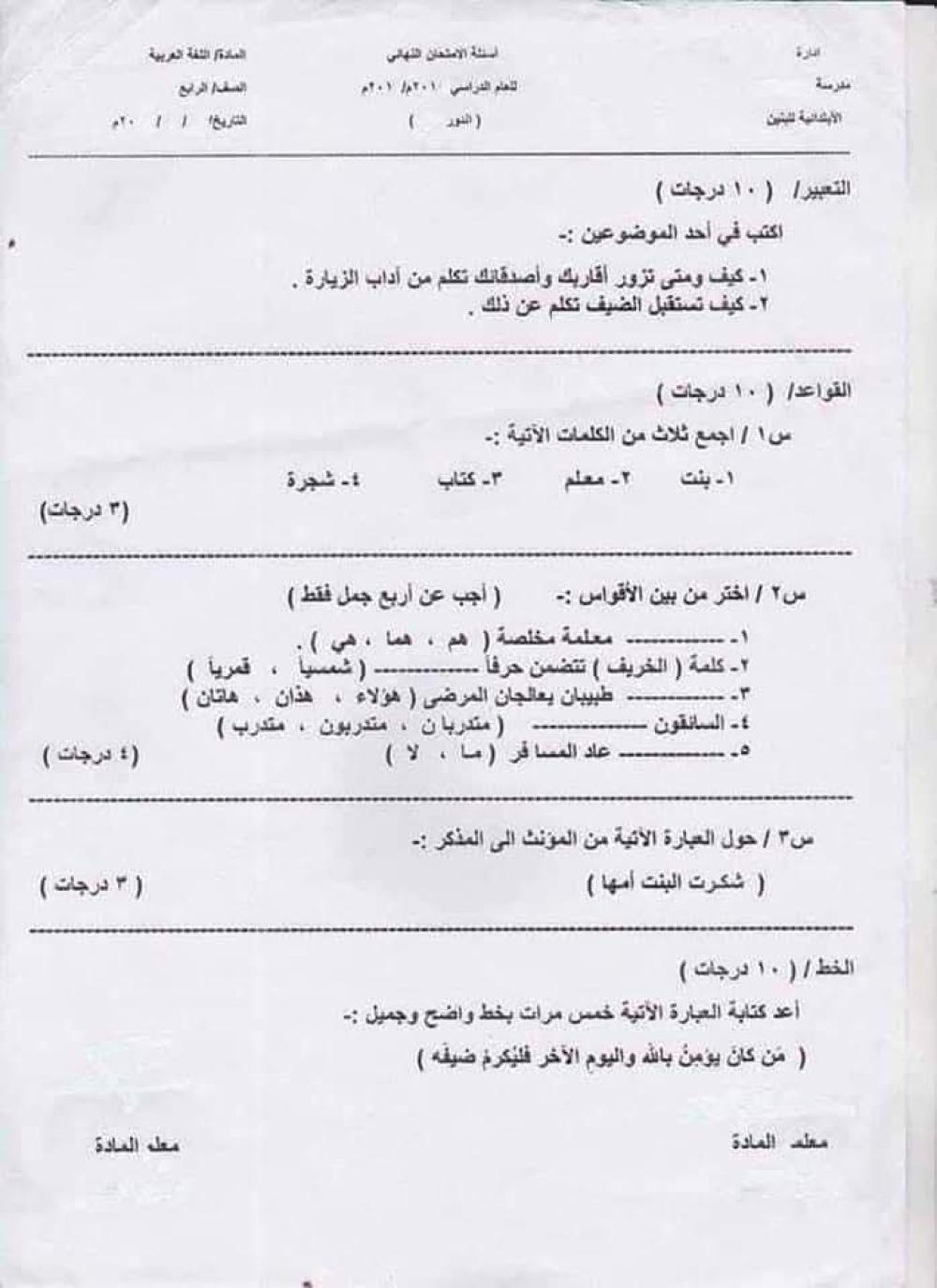 اسئلة اللغة العربية نهاية السنة للصف الرابع الابتدائي
