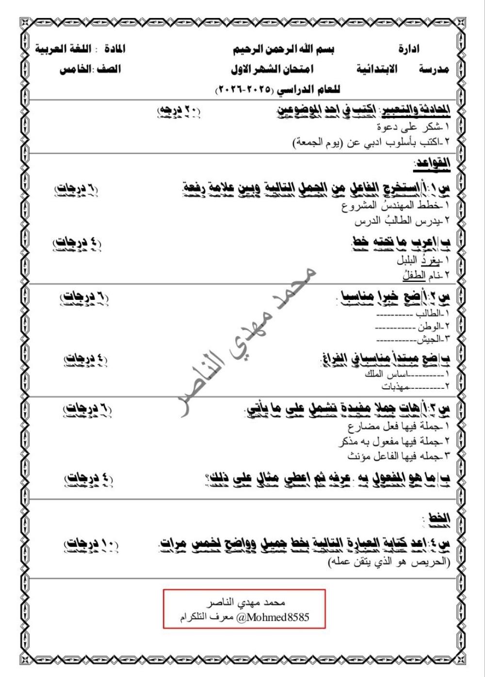 اسئلة لغة عربية الشهر الاول للصف الخامس الالبتدائي الاستاذ محمد مهدي