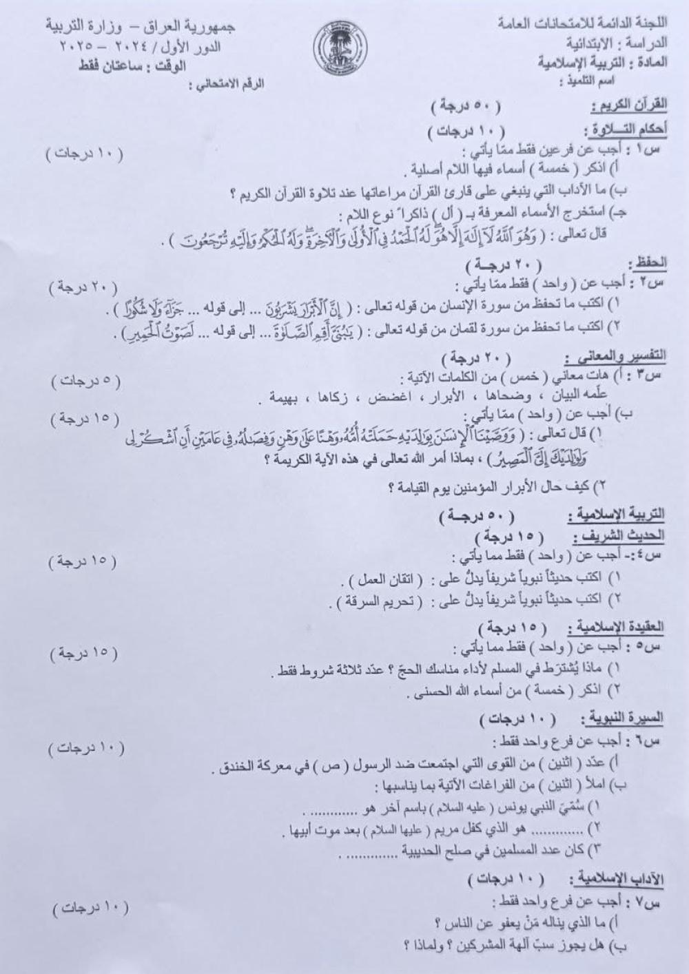 اسئلة الاسلامية الوزارية للصف السادس الابتدائي