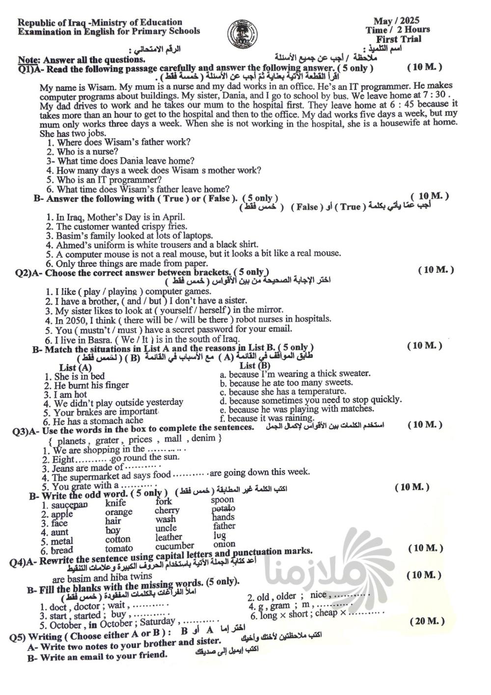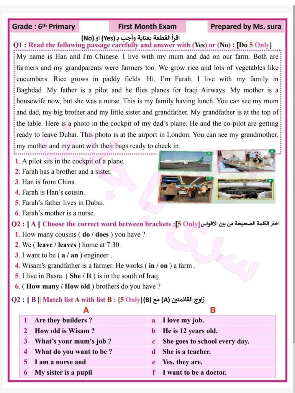 اسئلة الانكليزي الوزارية للصف السادس الابتدائي