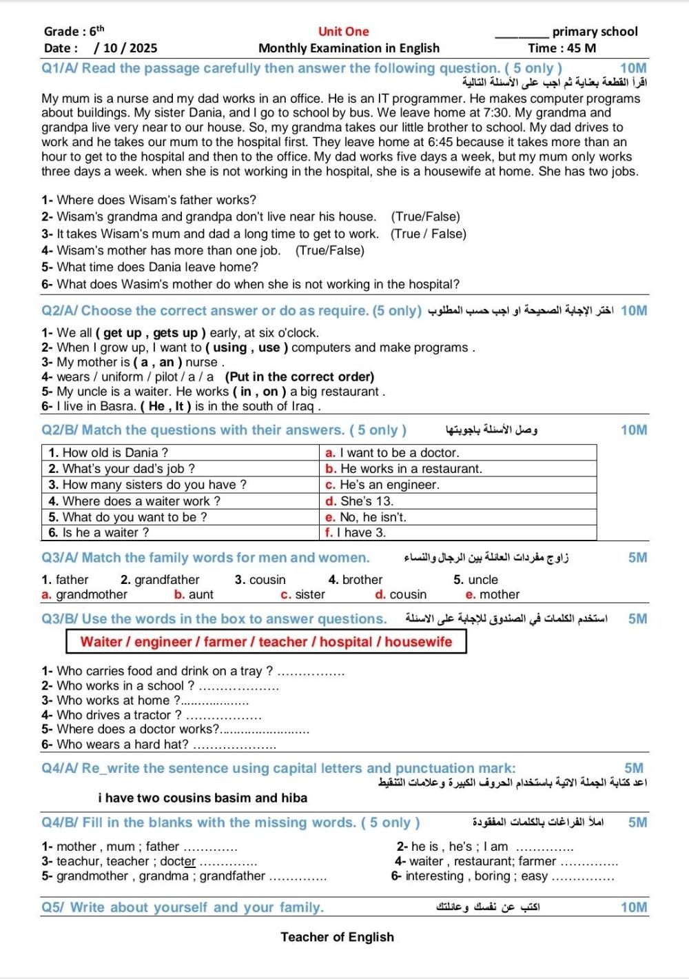 منذ شهراسئلة الانكليزي المنقح السادس الابتدائي اليونت الاول 2025