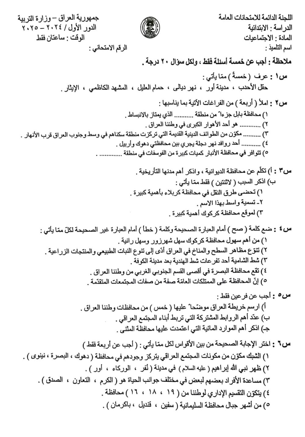 الاسئلة الوزارية لمادة الاجتماعيات للصف السادس الابتدائي اعداد الاستاذ اسامة محمود