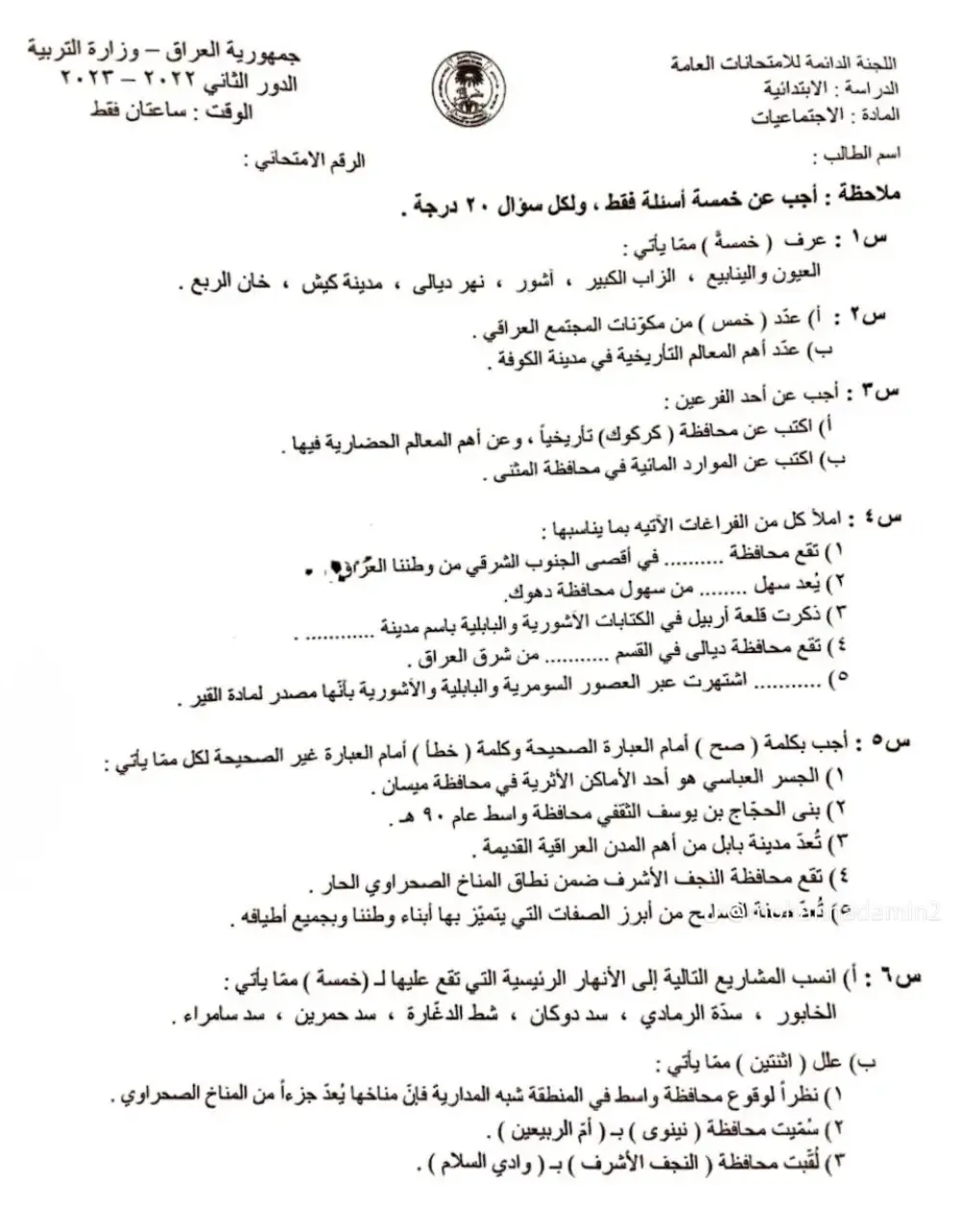 منذ 5 أشهراسئلة الاجتماعيات الوزارية للصف السادس الابتدائي
