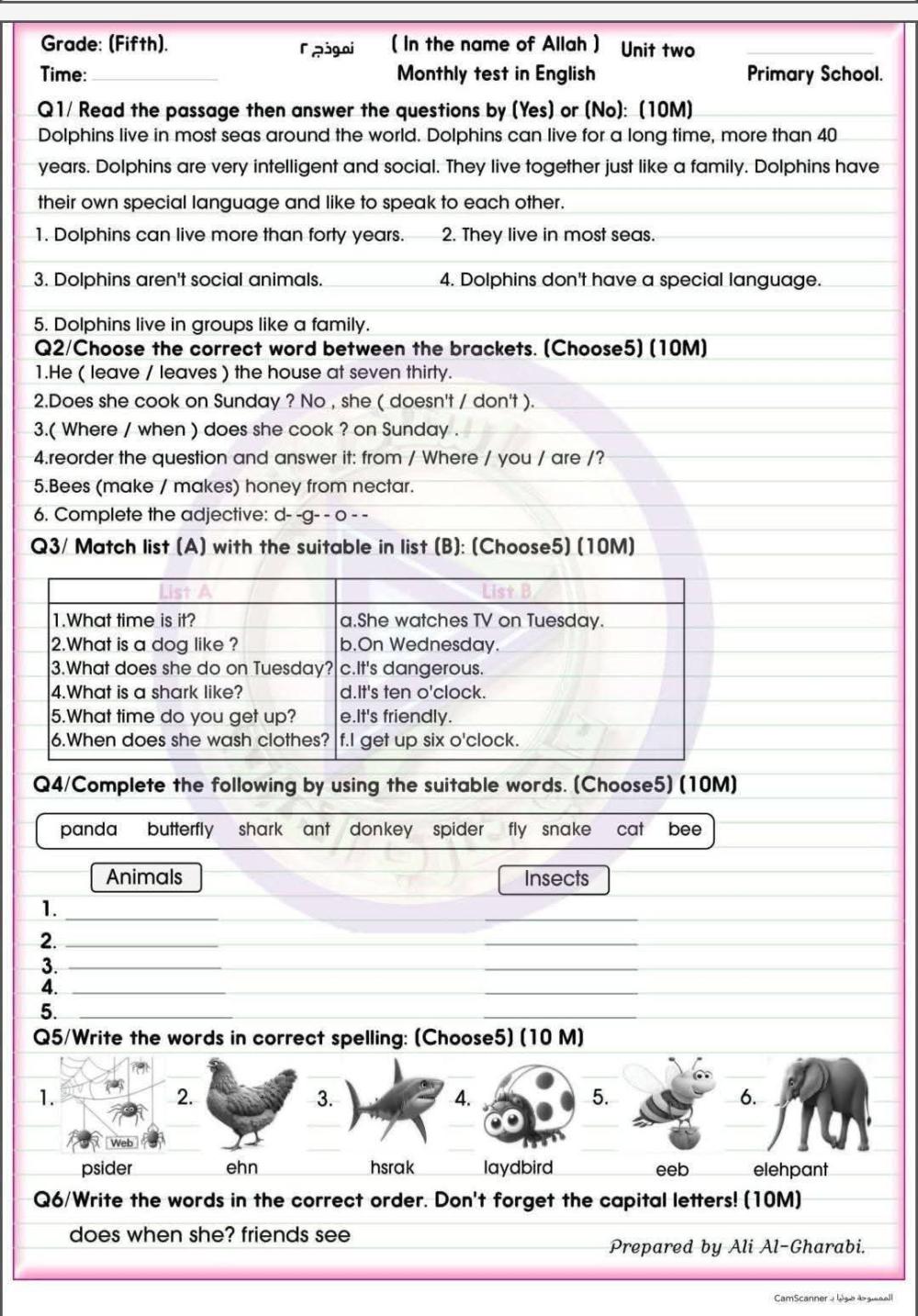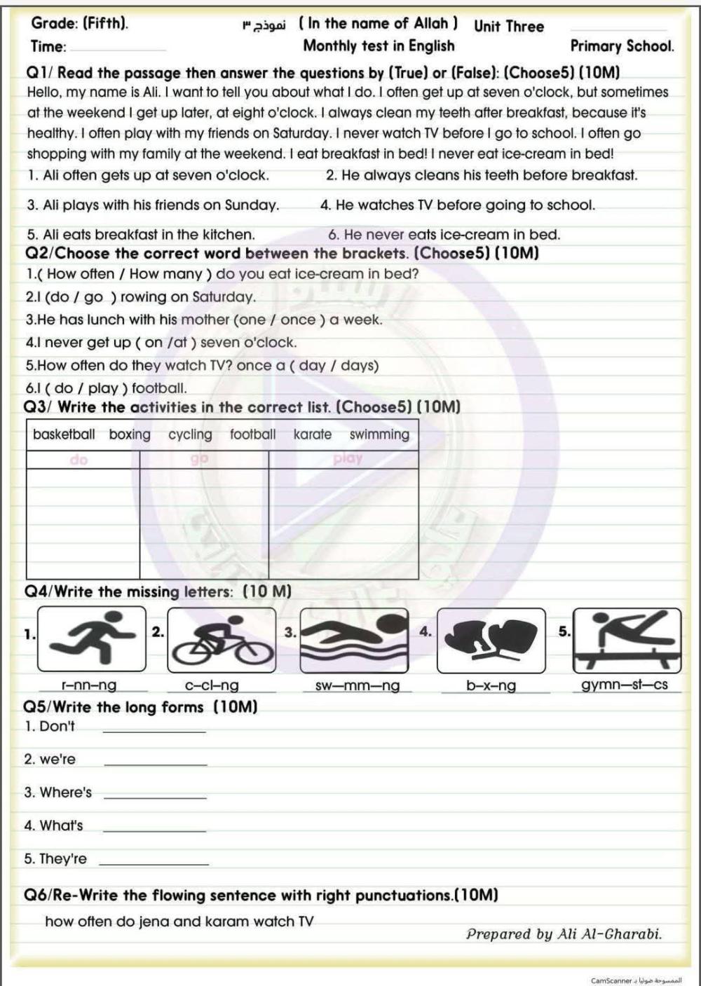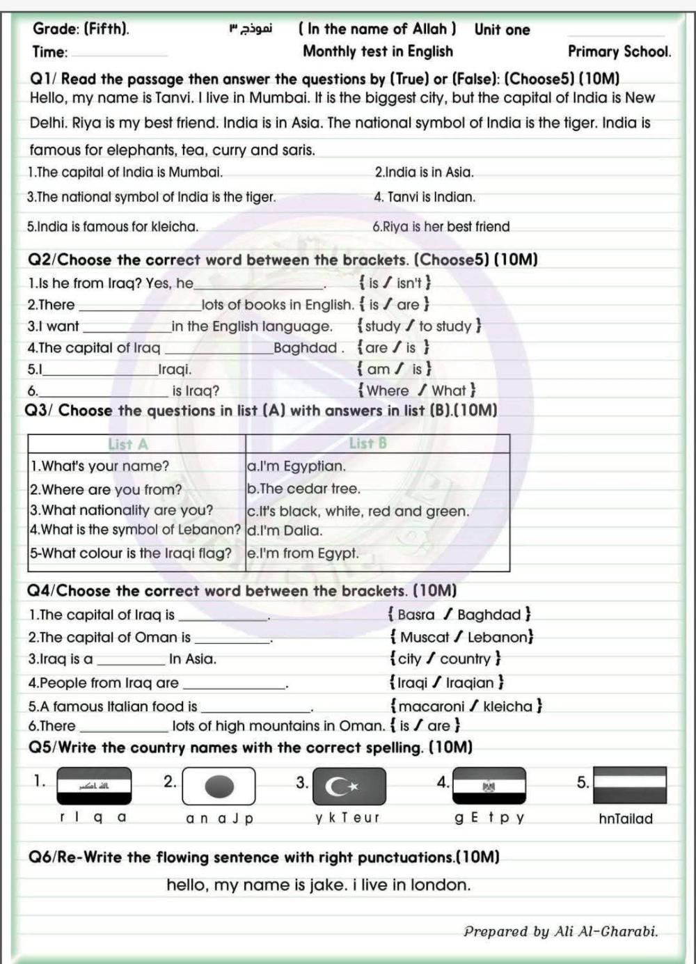 نماذج اسئلة انكليزي للصف الخامس الابتدائي الاستاذ علي داود