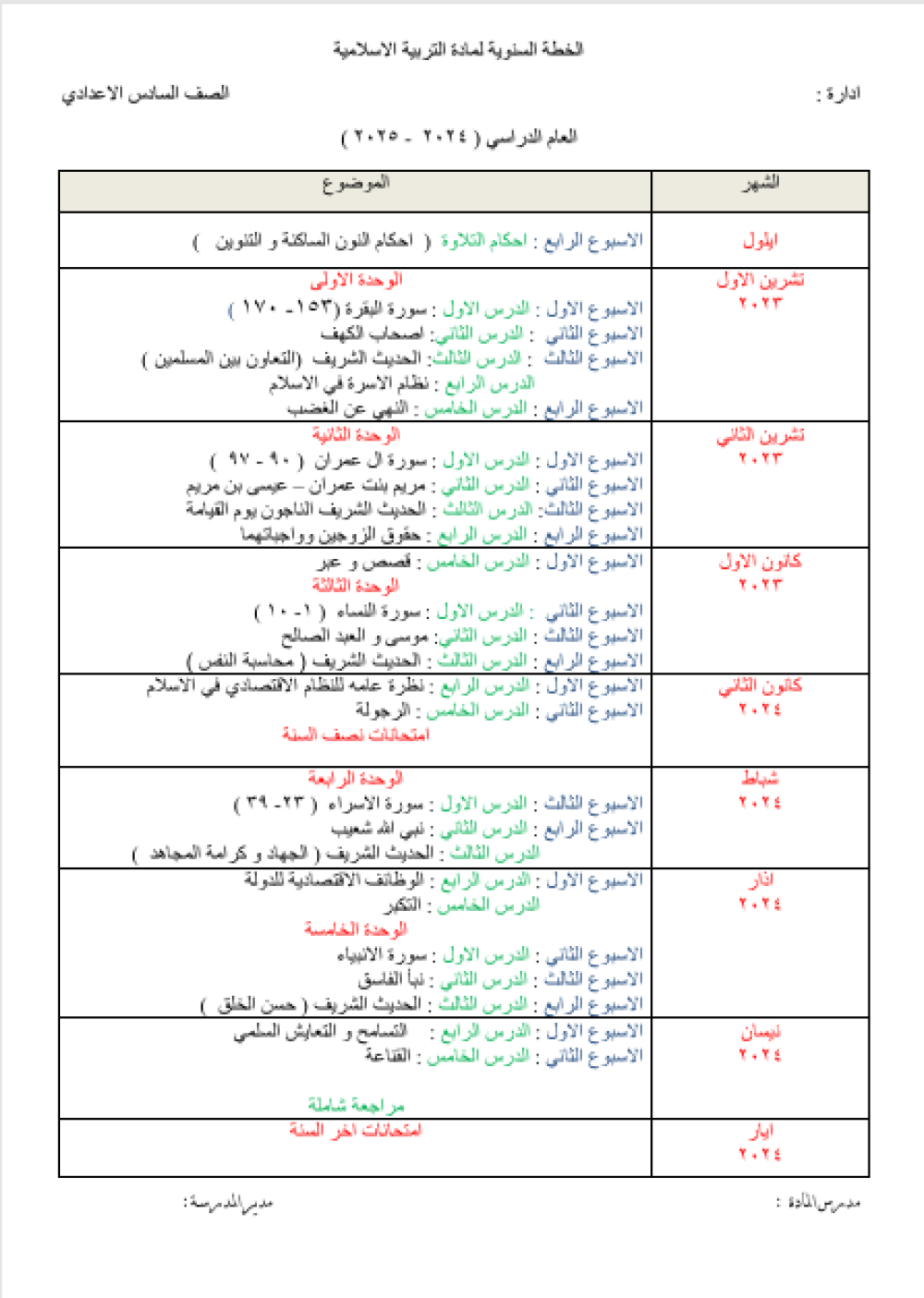 الخطة السنوية لمادة الاسلامية ( 2024 - 2025 ) الصف السادس الاعدادي