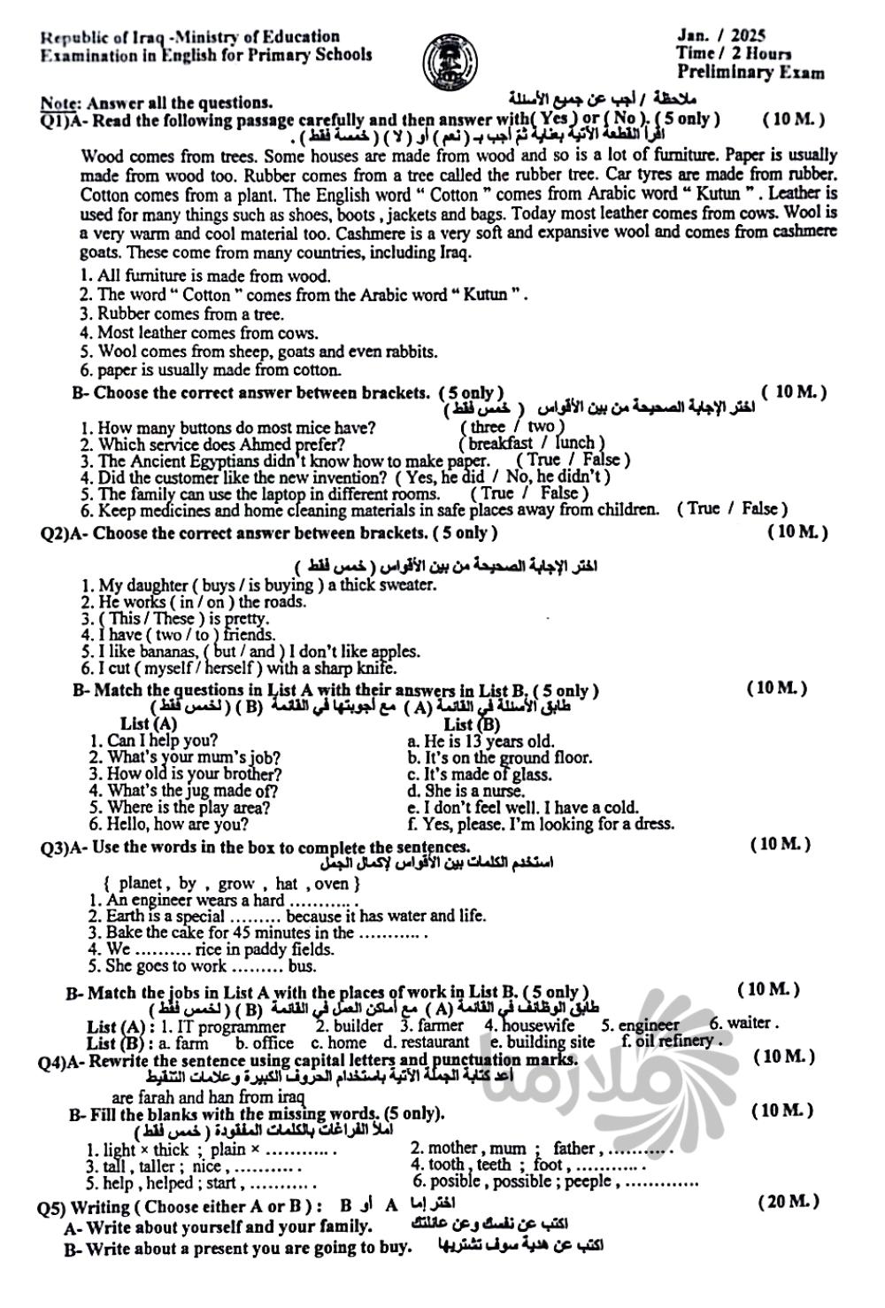 اسئلة الانكليزي الوزارية للصف السادس الابتدائي