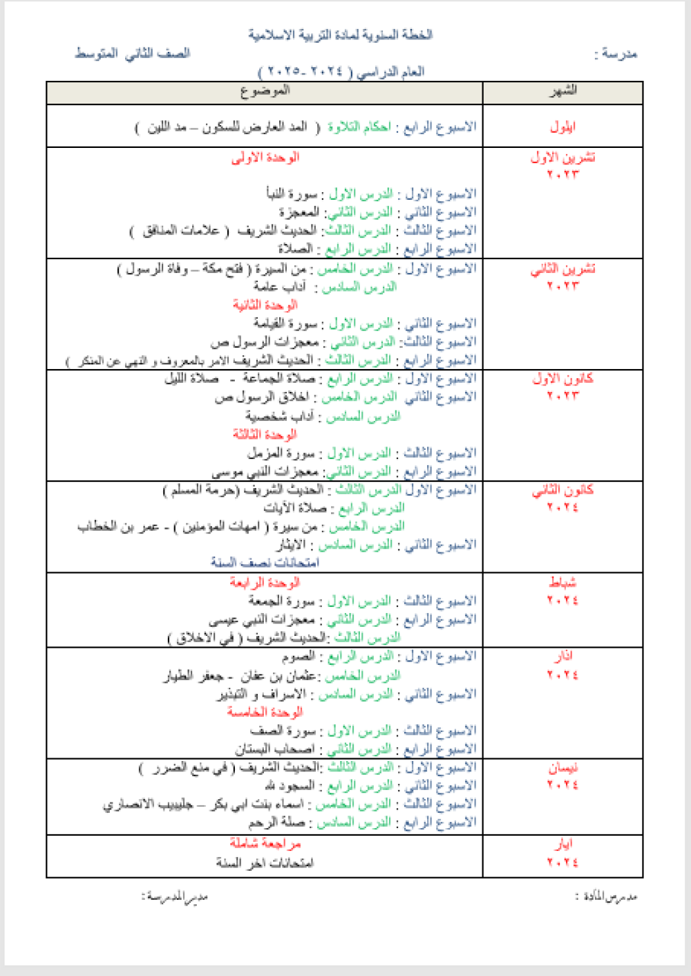 الخطة السنوية لمادة الاسلامية ( 2024 - 2025 ) الصف الثاني المتوسط