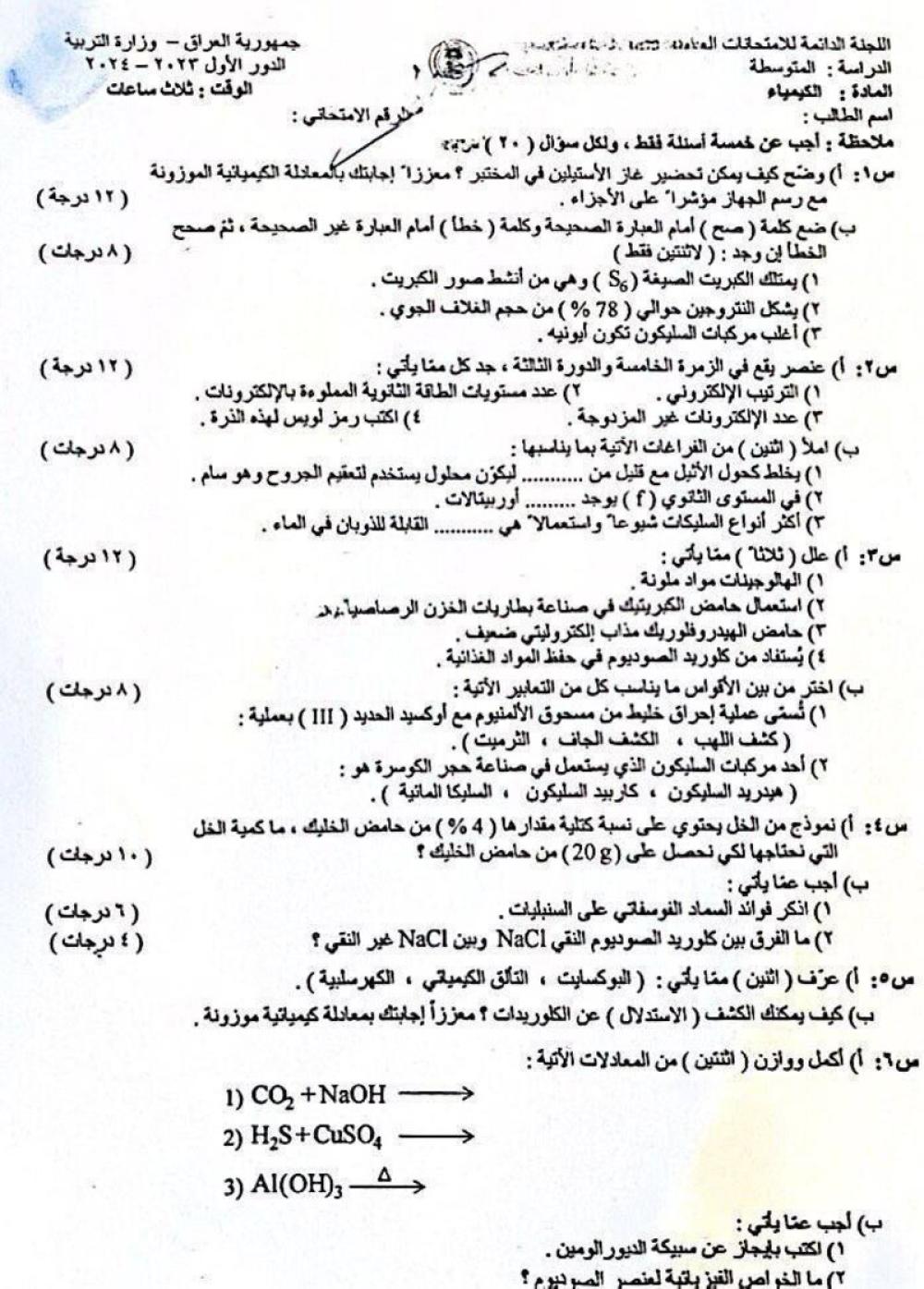 اسئلة الكيمياء الوزارية للصف الثالث المتوسط 2024