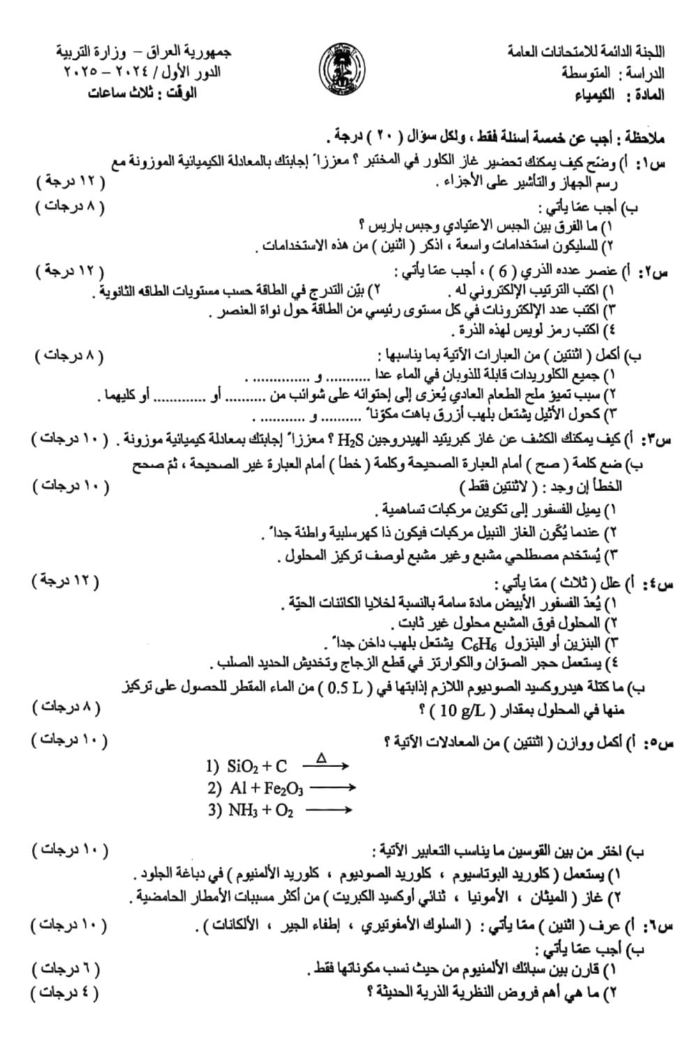 اسئلة الكيمياء الوزارية للصف الثالث المتوسط 2025