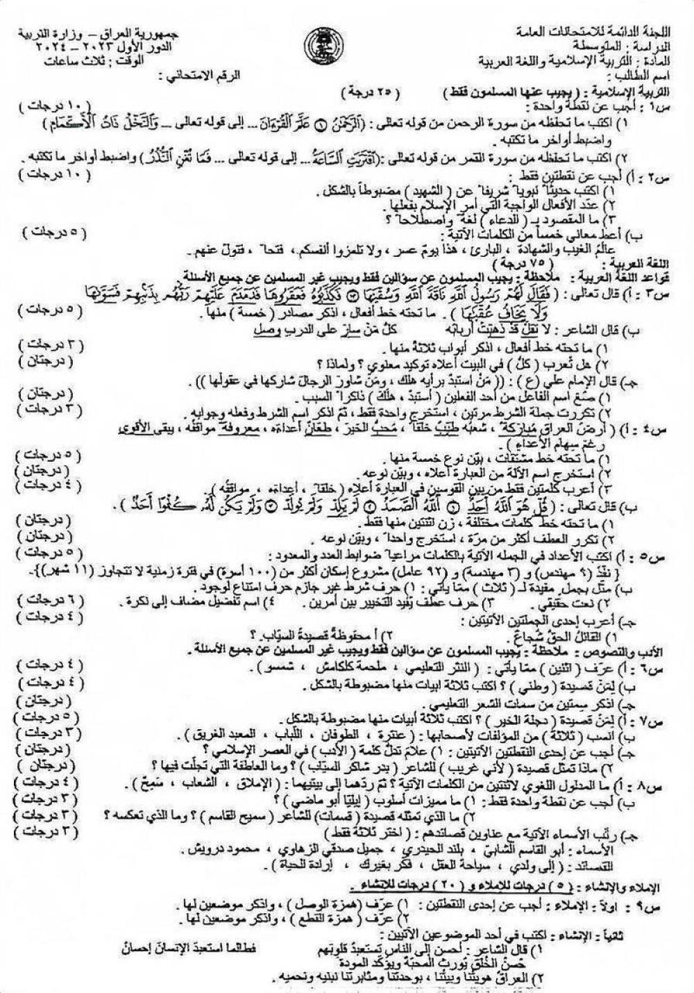 اسئلة العربي الوزارية للصف الثالث المتوسط 2024