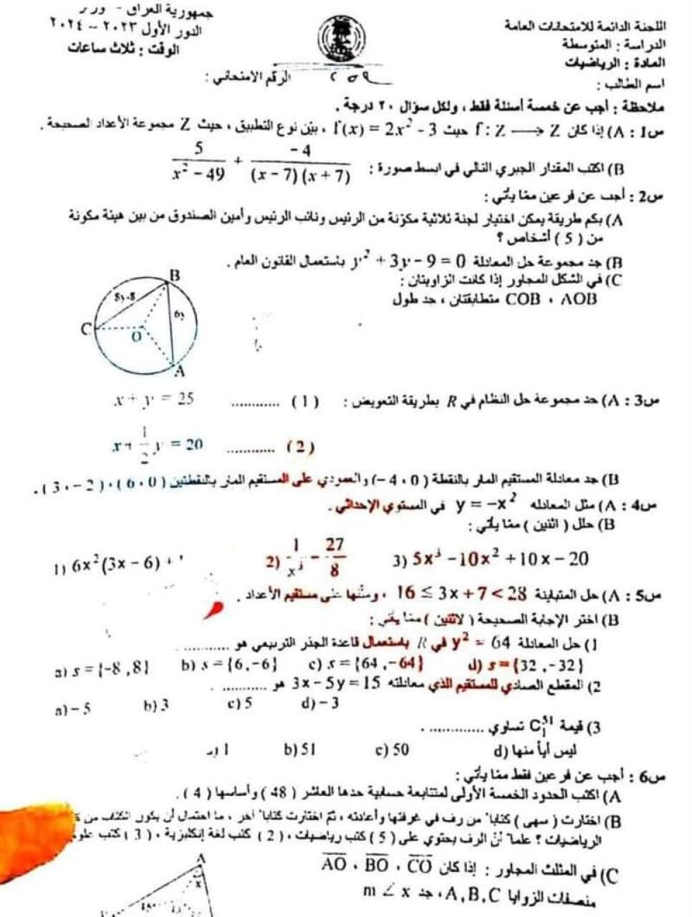 اسئلة الرياضيات الوزارية للصف الثالث المتوسط 2024