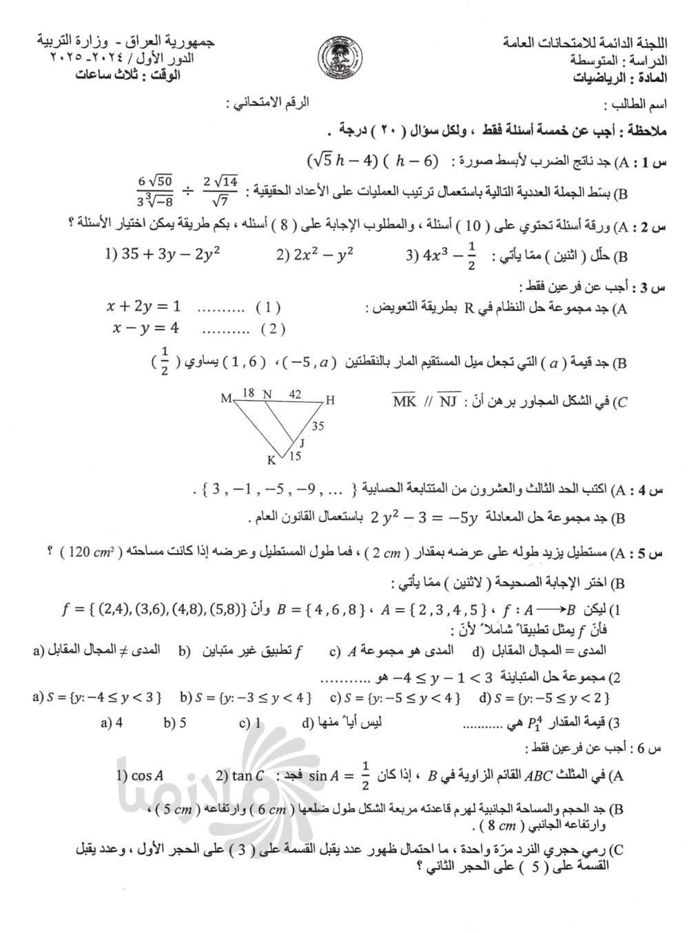اسئلة الرياضيات الوزارية للصف الثالث المتوسط 2025